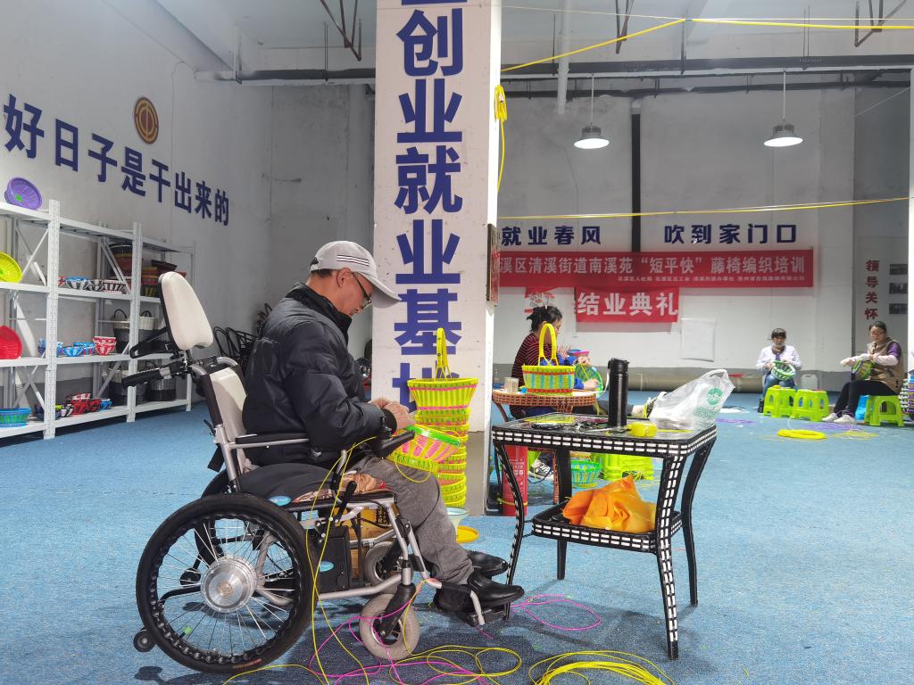 在贵阳市花溪区高坡苗族乡龙云村,村民王兴红刚参加了行军蚁公司在村里开设的藤编手工车间的培训会,学习手工编织果篮。王兴红今年47岁,10年前因不慎摔倒导致双腿残疾。由于行走不便,他只能在家养鸡种菜,勉强维持生活。“我编一个果篮能获25元的加工费,技术熟练后,一个月预计能挣2000元左右。”他说。